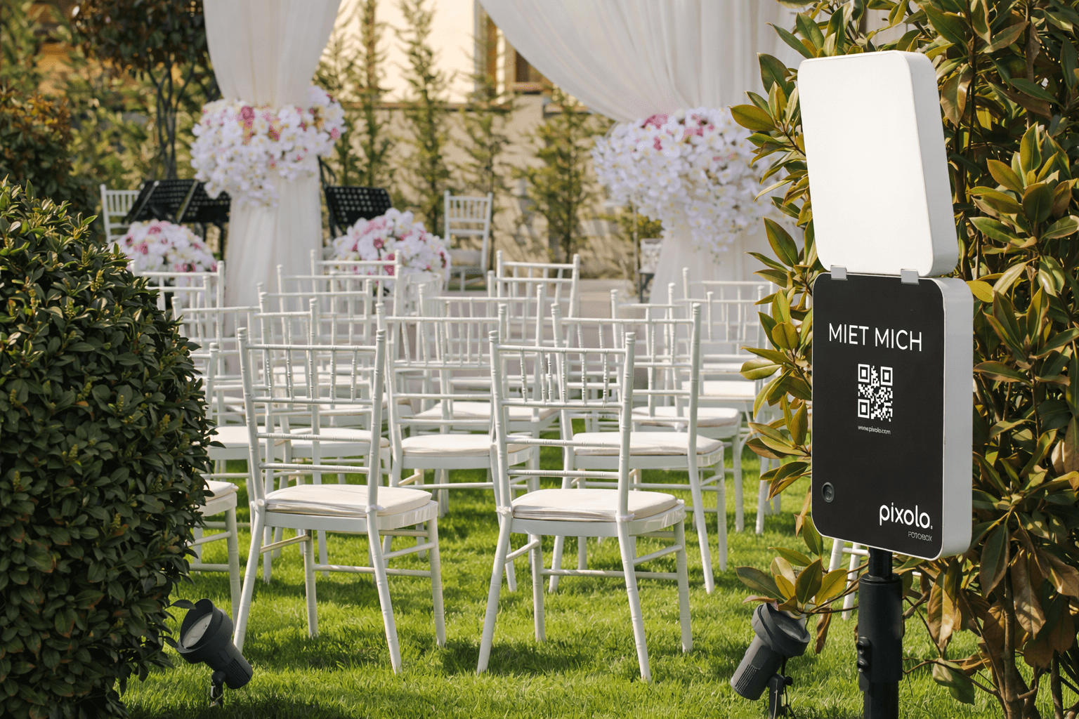 Die pixolo Fotobox ist draußen besonders praktisch, weil Du sie dank integriertem Akku flexibel positionieren kannst, ohne ein Kabel quer durch den Garten oder über Wege zu legen.